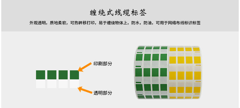 纏繞式線纜標簽又叫覆蓋式線纜標簽,標簽由兩部分組成,上半部分是白色或彩色的打印涂層,下半部分是透明的保護膜,使用時可以用透明保護膜覆蓋打印的區域,起到保護作用。透明的保護膜應該有足夠的長度以包裹電纜一圈或一圈半,粘貼的位子應在距線纜接頭3-10厘米的范圍之內,標簽內容應清晰可見,標簽應采用不易脫落介質。線纜的直徑決定了所需纏繞式標簽的長度。